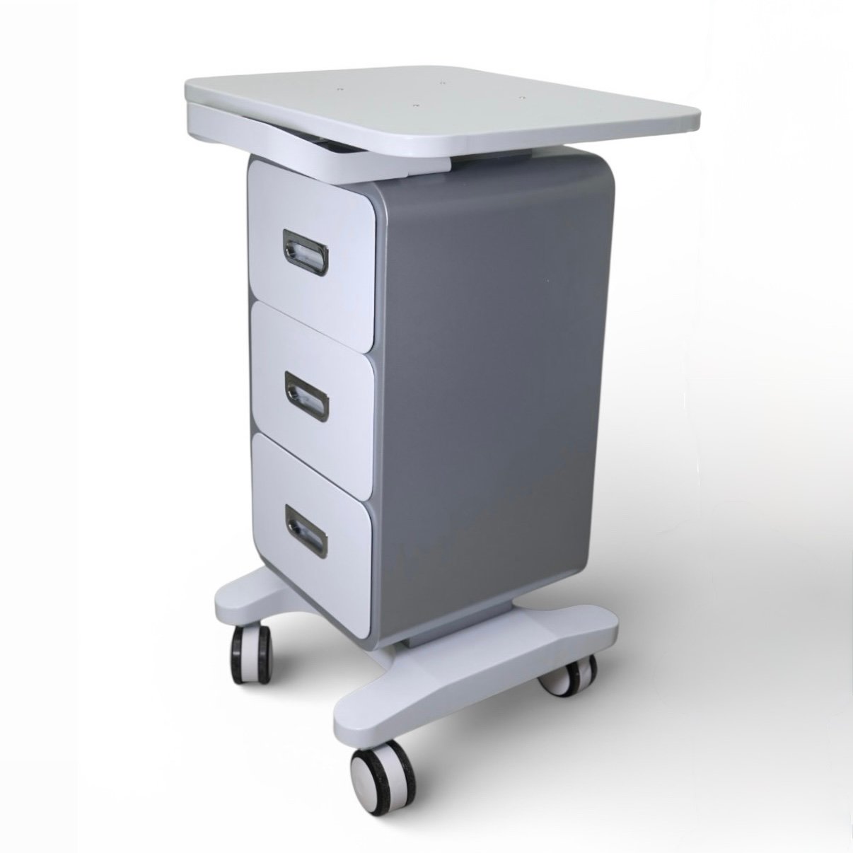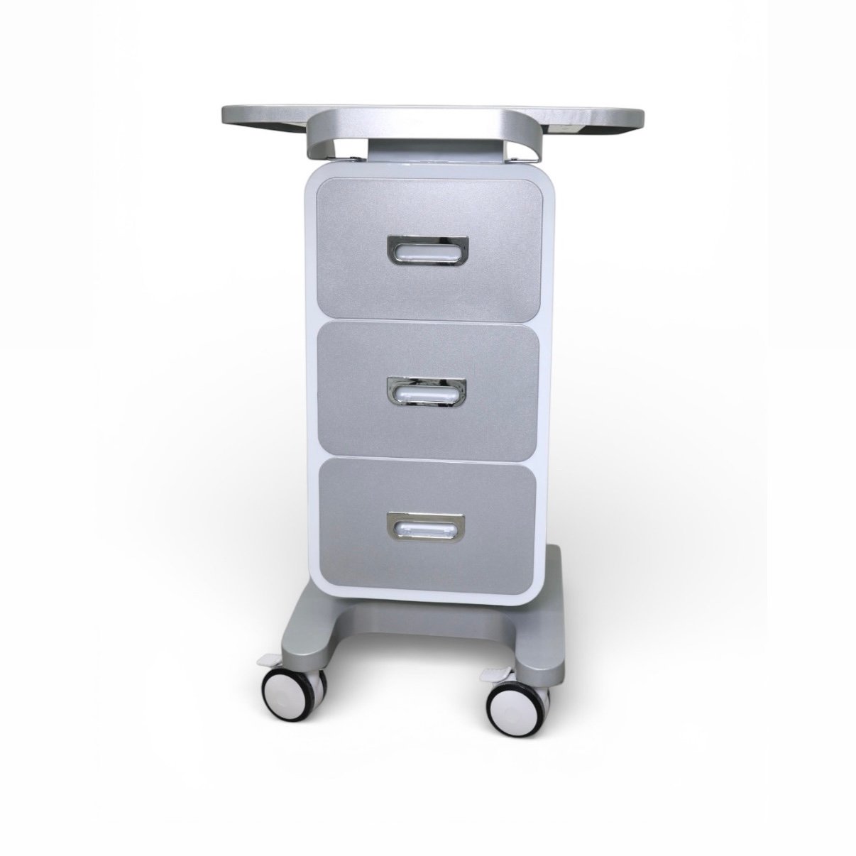 Чотири поворотні прогумовані коліщата забезпечують тихе та плавне переміщення візка по кабінету, не пошкоджуючи підлогу. Поєднання білого та сріблястого кольорів на корпусі та стільниці створює чистий, технологічний вигляд, який гармонійно поєднується з більшістю косметологічних апаратів і інтер’єрів преміум-класу.
